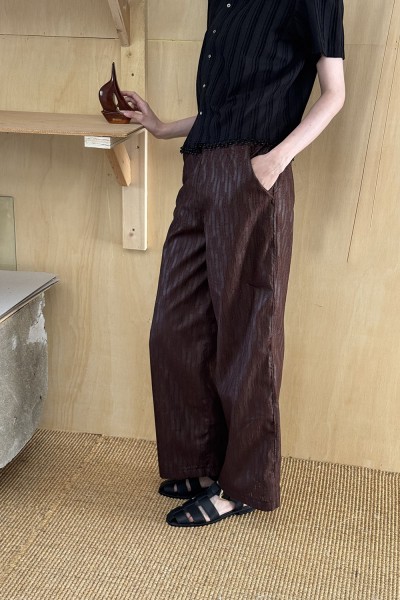 폴리에스터 원단의 물결패턴 캐주얼 팬츠입니다. 좌우 포켓 및 반광의 은은한 질감이 있습니다. 브라운색상